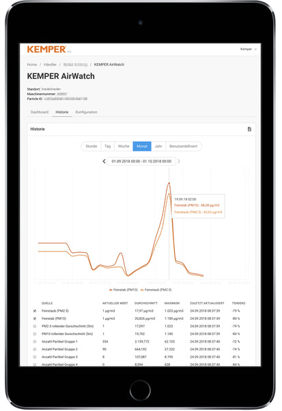 AirWatch monitora continuamente la qualità dell'aria nei capannoni di produzione e nei magazzini tramite un metodo di misurazione ottico e laser. I valori rilevati – che includono il numero e la distribuzione granulometrica delle particelle di polvere fine – vengono archiviati in un cloud tramite tecnologia mobile e possono essere visualizzati e analizzati ovunque da PC, smartphone o tablet. Un'area illuminata a LED (verde, giallo, rosso) sullo stesso AirWatch indica la qualità dell'aria nel capannone. Inoltre, AirWatch controlla i sistemi di ventilazione e aspirazione dei locali, garantendone così un uso efficiente in base alle necessità.